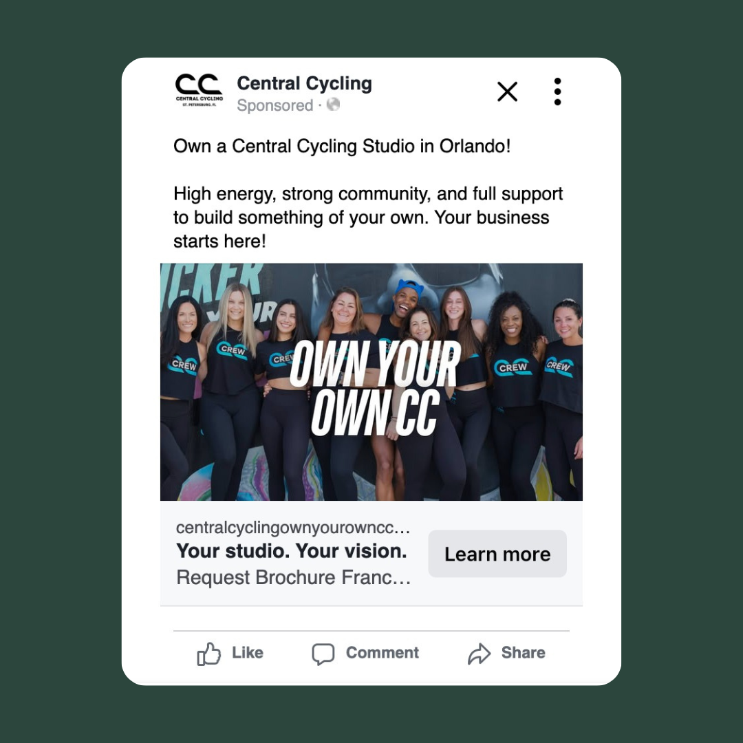 To generate brand awareness and franchise interest in the Orlando market, I developed a highly targeted Facebook ad campaign designed to drive traffic to Central Cycling’s franchise landing page. This campaign effectively reached new audiences while also engaging existing followers.